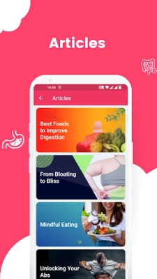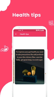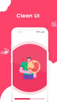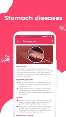 The app covers a wide range of stomach diseases, including Celiac disease, Appendicitis, Barrett's esophagus, Colon Cancer, Bloating, Constipation, Crohn's disease, Cyclic vomiting syndrome, Diarrhea, Diverticulitis, Esophageal cancer, Gastritis, Gastroparesis, Acid reflux, Food poisoning, Gallstones, Ulcerative colitis, Irritable bowel syndrome (IBS), Hemorrhoids, Lactose intolerance, Stomach cancer, Zollinger-Ellison syndrome, and preventing infection at home.