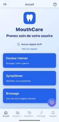 With our innovative app, builded during a Phd of a French dental surgeon, staying on top of your dental health has never been easier or more convenient. Whether you’re symptom-free and looking to maintain your sparkling smile or seeking guidance for specific oral health concerns, MouthCare is here to support you every step of the way.
