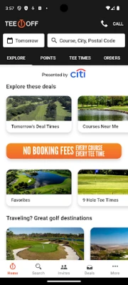 Featuring millions of golf tee times and DEALS you won’t find anywhere else! TeeOff makes it easier for you to find your next tee time, save with exclusive offers at your favorite golf courses, and get rewarded for playing golf with your buddies. Plus, TeeOff offers all golfers NO BOOKING FEES – every golf course, every tee time.